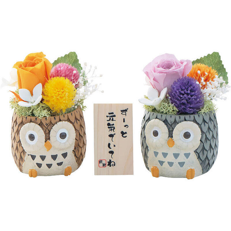 プリザーブドフラワー(千日紅、バラ、カスミ草、モス)、アートフラワー、器(ふくろう・レジン製)
