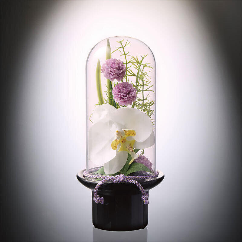 お手入れはガラスドームを拭くだけ。花にホコリが付くことがないのでいつまでも美しい状態で飾れます。高品質な胡蝶蘭が主役の高貴で華やかな供花です。