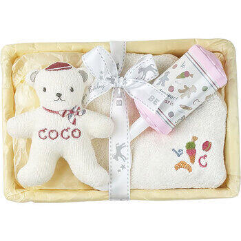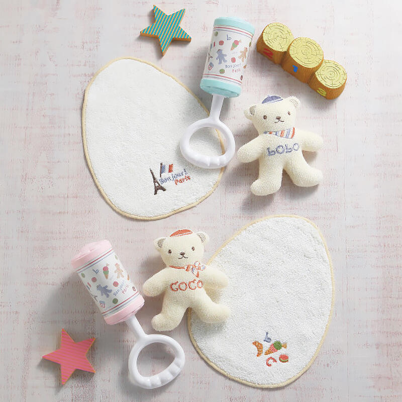 ガラガラクマ・授乳スタイ・チャイム×各1●(ガラガラクマ・授乳スタイ)家庭洗濯可(手洗い)●対象年齢:(ガラガラクマ)0ヶ月~、(チャイム)3ヶ月~