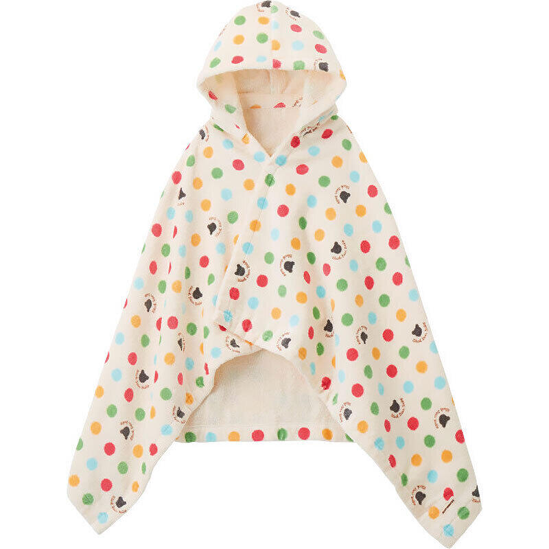 ドットと黒クマ柄のフード付きバスポンチョです。広げればバスタオル、ホックをとめればポンチョとして使用可能。お風呂あがりや、プールの後にも便利です。新生児から2歳ごろまで使え、出産祝い、プレゼントにおすすめです。