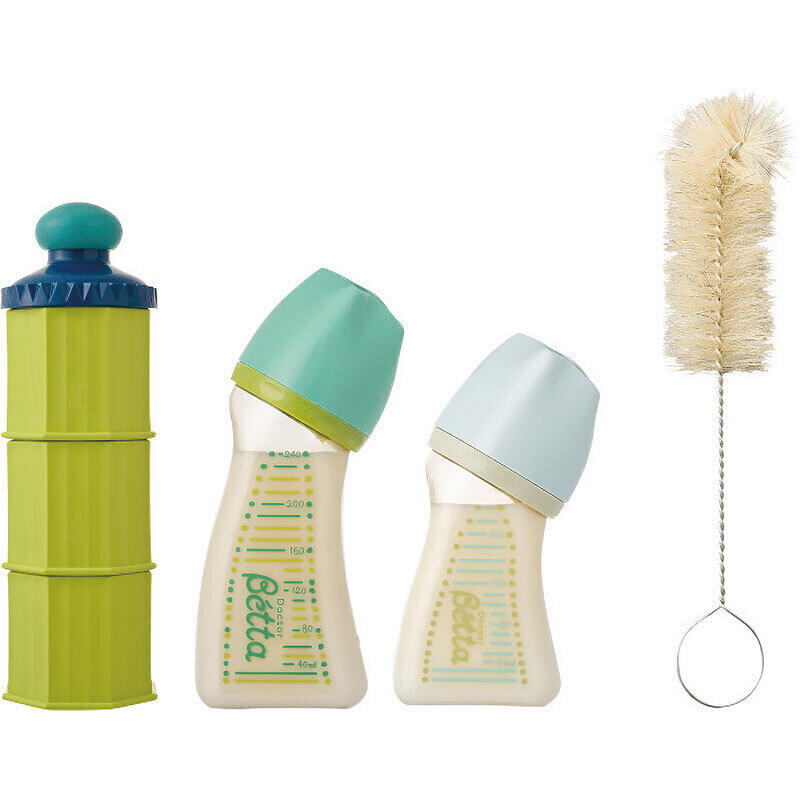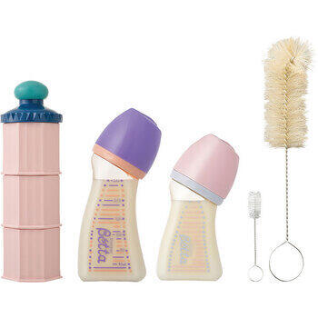 母乳授乳と同じ赤ちゃんが最も飲みやすい姿勢で飲むことができるドクターベッタ哺乳びん。耳管へのミルクの流入を防ぎ、誤嚥防止、吐き戻しを軽減します。調乳しやすくて、洗浄しやすい広口ボトル240mlと160mlの2本、隅々まで洗えるブラシ、便利でかわいいかたちのミルクケースのセットです。