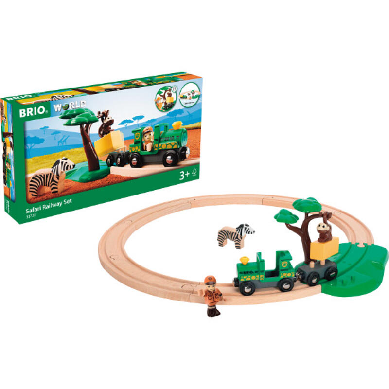 サファリレールでサバンナを冒険しましょう。おさるさんがワゴンから食べ物を取ろうとしています。サファリワゴンと機関車がセットになっています。