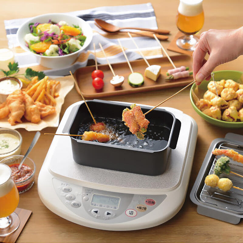 四角い揚げ物鍋は少ない油でOK!油も節約できて、収納すっきり!長方形なのでコンパクトながらも長さのある食材にも対応でき、お弁当のちょこっと揚げにも使いやすい揚げ鍋です。とんかつや天ぷら・唐揚げはもちろん、ホームパーティーで串揚げなども楽しめます。付属のフタは、バット代わりに下準備にも使うことができ、調理中はアミと合わせて油切りの受け皿として使用できます。揚げ物に必要なセットが揃うので手軽に揚げ物調理ができ、使用後は揚げ鍋とアミ・フタを重ねるとコンパクトに収まり、引き出しなどの省スペースにもスッキリ収納できます。ガス火・IH対応です。