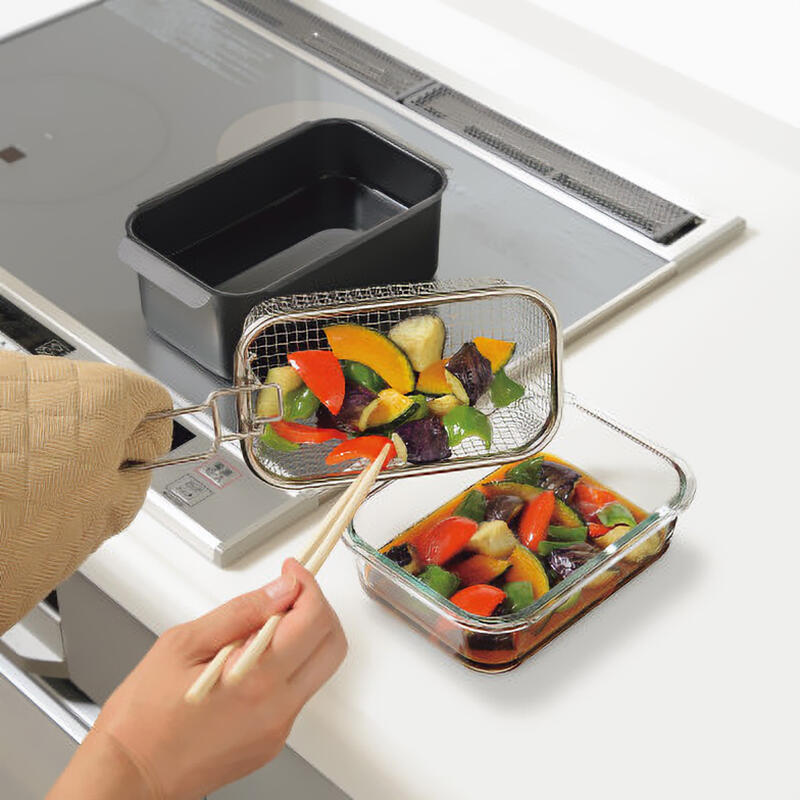 食材の油を一気に切れる角型揚げざる!つかみにくいポテトや、からあげの二度揚げにも。取っ手が折りたためてコンパクトに収納できます。