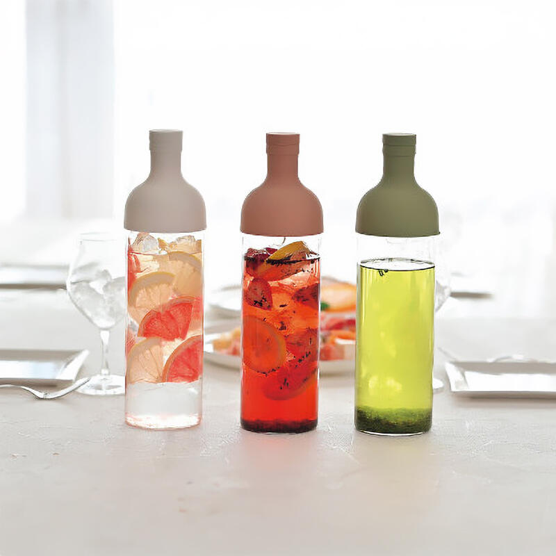 ワインボトル型の水出し茶ボトル。注ぎ口部分にフィルターがセットされているのでそのまま注ぐことができます。