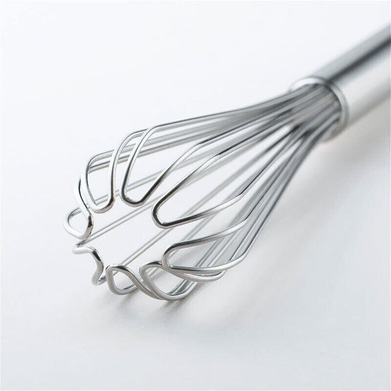 スリムタイプなので小さめのボウルや計量カップでの混ぜ合わせに便利なウィスクです。底あたりがよく効率的に混ぜられる茶せん形状の先端で、汚れがたまりにくい仕様です。衛生的なオールステンレス製。