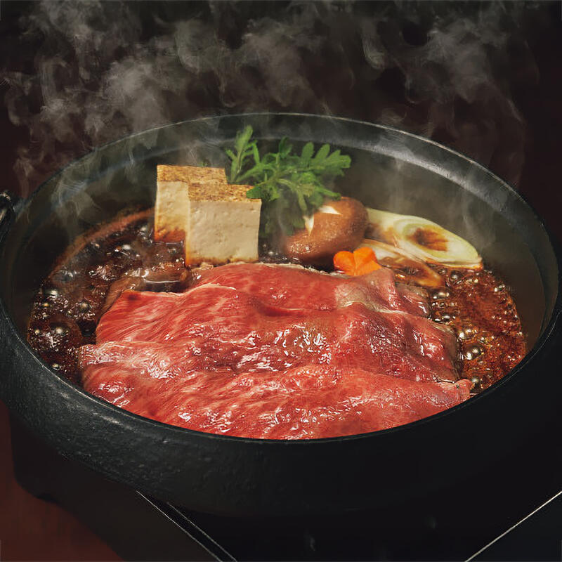 松阪牛の霜降りの肩ロースのすき焼き用です。霜降りのお肉は、やはり甘辛い割り下との相性が抜群です。
