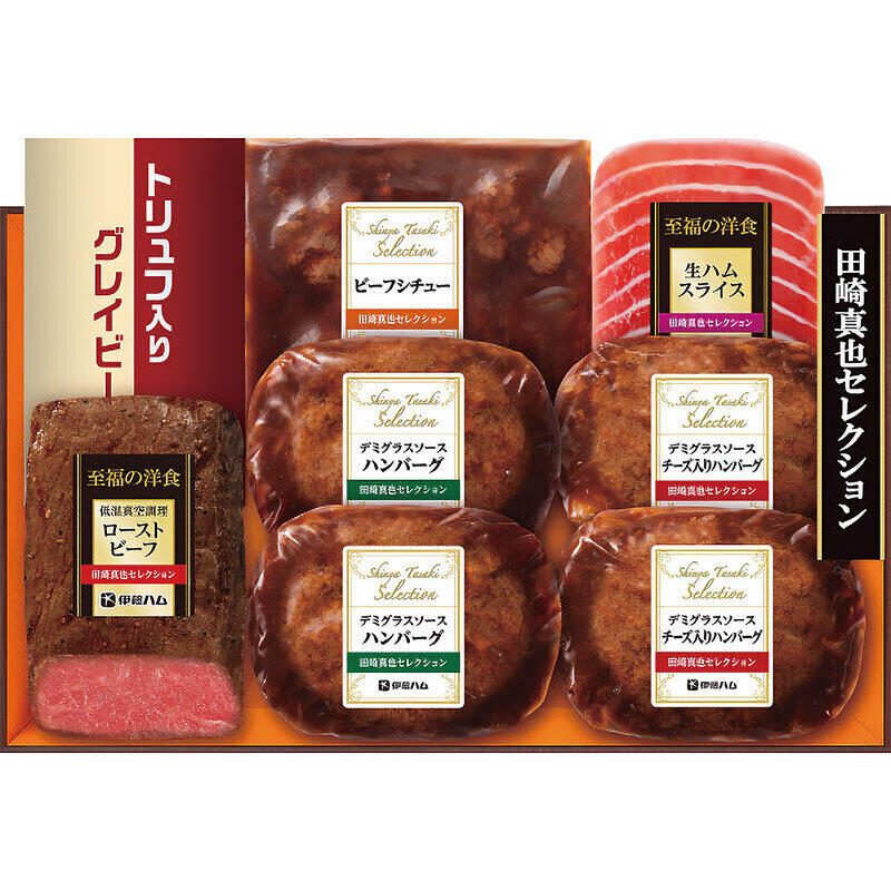 低温真空調理ローストビーフ(もも)200g、トリュフ入りグレイビーソース30g、生ハムスライス45g、ビーフシチュー180g、デミグラスソースハンバーグ(牛肉・豚肉使用)・デミグラスソースチーズ入りハンバーグ(牛肉・豚肉使用)各120g×各2