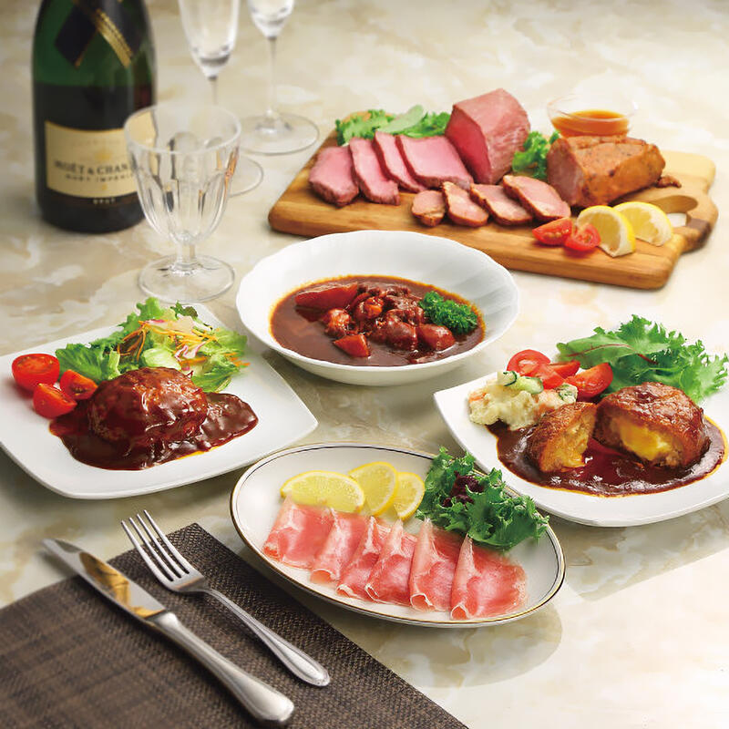 低温真空調理(ローストビーフ(もも)200g、ローストポーク160g)、トリュフ入りグレイビーソース30g、ビーフシチュー180g、生ハムスライス45g×2、デミグラスソースハンバーグ(牛肉・豚肉使用)・デミグラスソースチーズ入りハンバーグ(牛肉・豚肉使用)各120g×各2