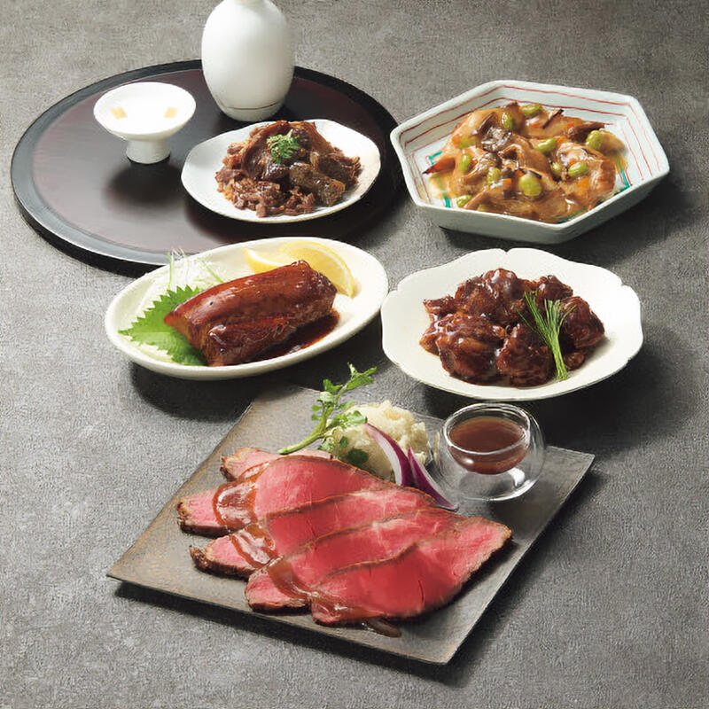 賛否両論(サーロインローストビーフ350g、牛とろとろ煮・鶏肉と野菜の炊き合わせ各150g、豚角煮香味醤油仕立て130g、牛しぐれ煮ごぼう55g)、ローストビーフソース和風ゆず風味60g