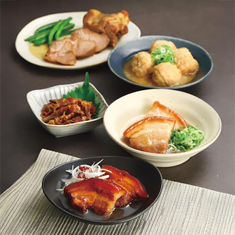 賛否両論(香味叉焼・つくねの蕪みぞれ仕立て各180g、豚角煮(香味醤油仕立て130g×2、だし仕立て130g)、牛しぐれ煮ごぼう55g)