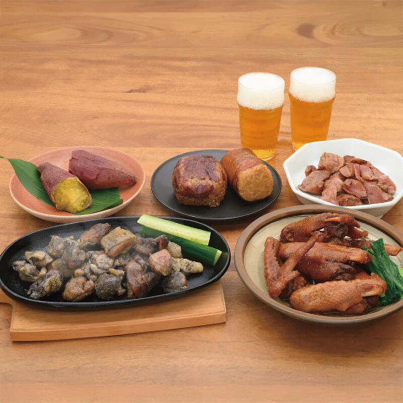 肉巻きおにぎり120g、宮崎牛おにぎり120g、鶏炭火焼100g、鶏炭火焼ゆず胡椒味90g、じっくり煮込んだやわらかい手羽煮450g、やわらかい砂肝焼100g、太陽の紅はるか1本