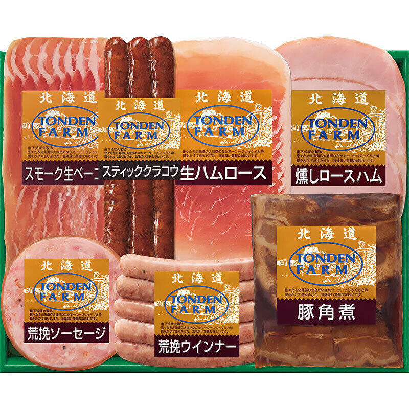豚角煮160g、荒挽ウインナー100g、スティッククラコウ(ソフトサラミソーセージ)80g、荒挽ソーセージ70g、スモーク生ベーコン(スライス)・燻しロースハム各60g、生ハムロース(スライス)40g
