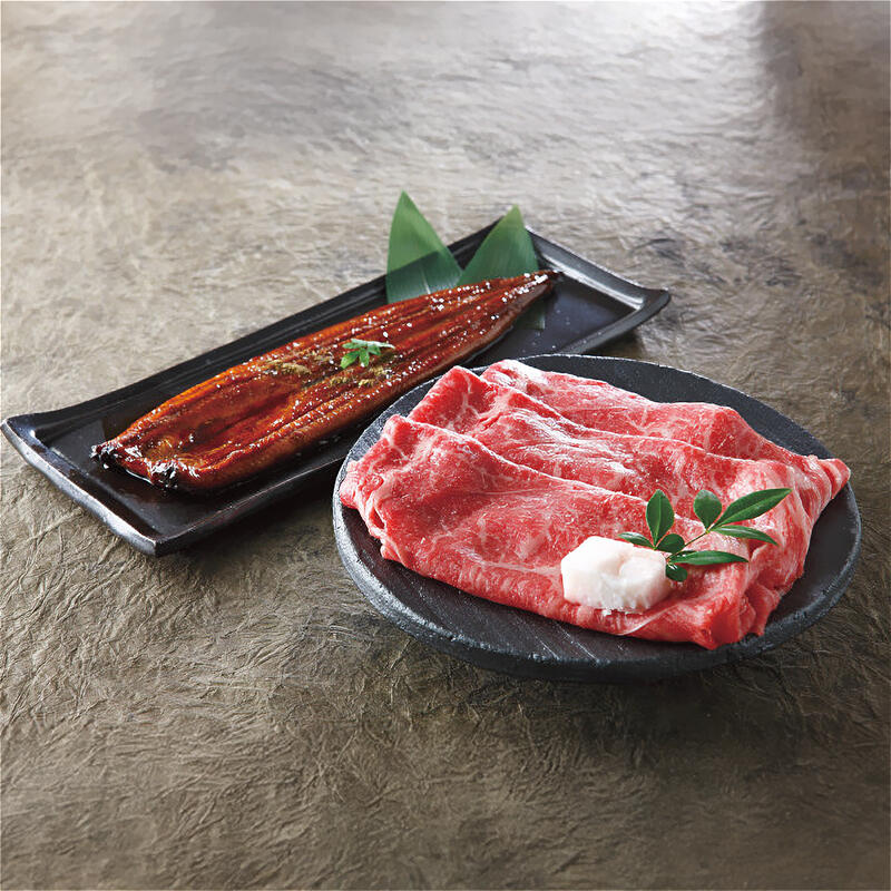 神戸ビーフのモモすき焼き用と香ばしくじっくり焼きあげ、丁寧に仕上げた鹿児島県産うなぎの蒲焼きとの詰合せです。