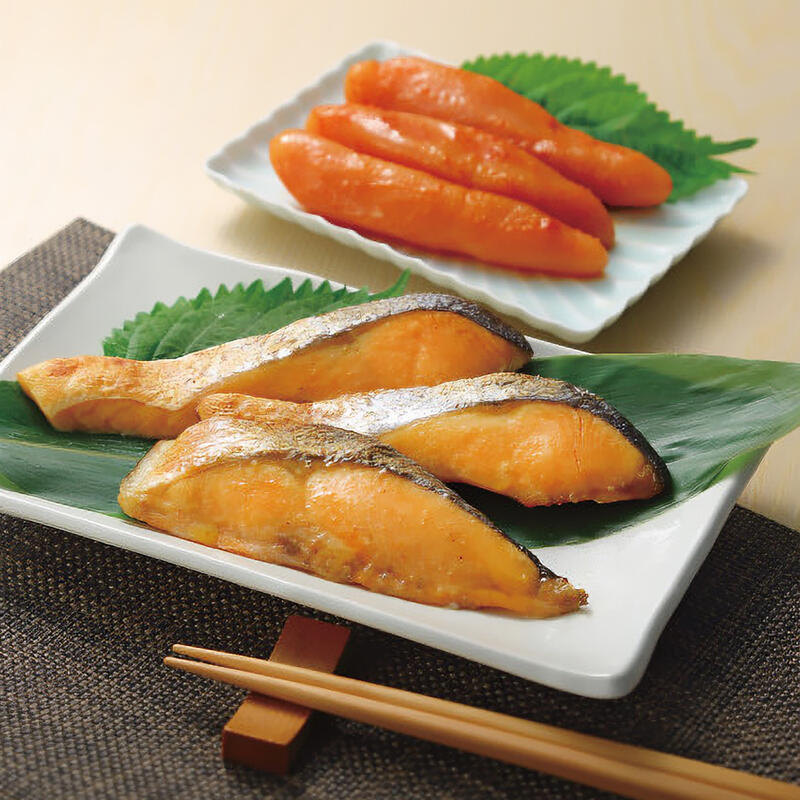 博多鳴海屋の素材を生かし味わい深く仕上げた辛子明太子と明太子のつけダレを使い、じっくり漬け込んだ旨味たっぷりの鮭の明太漬けとの詰合せです。