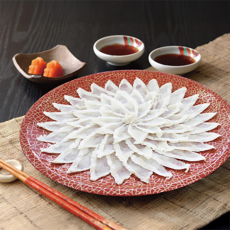 真ふくの身を熱湯にサッとくぐらせた後、氷水に浸けることにより旨味を閉じ込める調理技法「霜降り造り」の刺身セットです。ポン酢ともみじおろしでお召し上がりください。