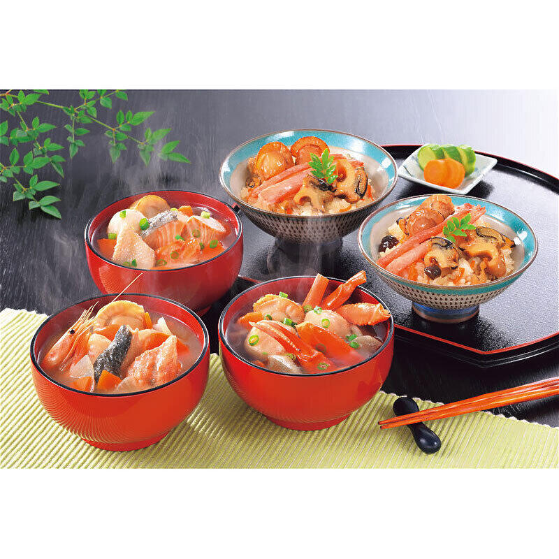 海鮮おこわ170g×2、石狩鍋280g・かに鍋280g・鮭うしお汁280g×各1(北海道小樽製造)
