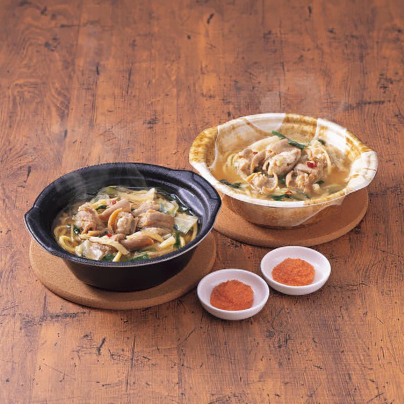 もつ鍋やまや監修の電子レンジで簡単に調理ができる個食もつ鍋です。もつ肉、野菜、ちゃんぽん麺が入って、味もボリュームも大満足!あごだし醤油と味噌味の2種類をご用意しました。辛子明太子の小袋が付いて、博多の味をご自宅で手軽に味わえます!