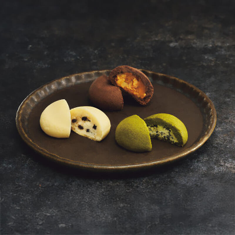 食感が楽しい素材がたっぷりつまった、包あん型のクッキー。【チョコクッキー&キャラメルナッツ】チョコ生地になめらかなキャラメルとサクサクナッツが入ったクッキー。【プレーンクッキー&ラムレーズン】プレーン生地にラムレーズンが入ったクッキー。【宇治抹茶クッキー&ココアビスケット】宇治抹茶の生地にザクザク感が楽しいココアビスケットが入ったクッキー。