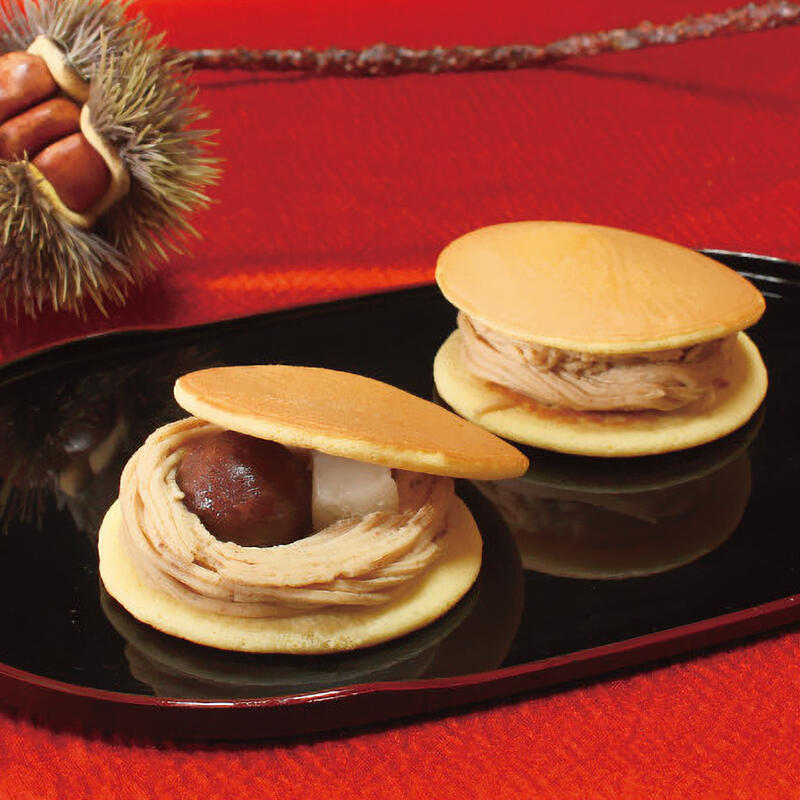 風味豊かでなめらかな口当たりの特製モンブラン餡に渋皮付き一粒栗と求肥餅をのせふんわり焼き上げたどら焼き生地で挟んだ創作スイーツです。