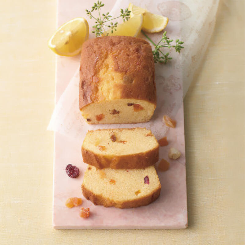 オレンジピール・レモンピール・チェリー・パイン・レーズンの5種のフルーツを生地に練り込み、丁寧に焼き上げた香り豊かなフルーツケーキです。