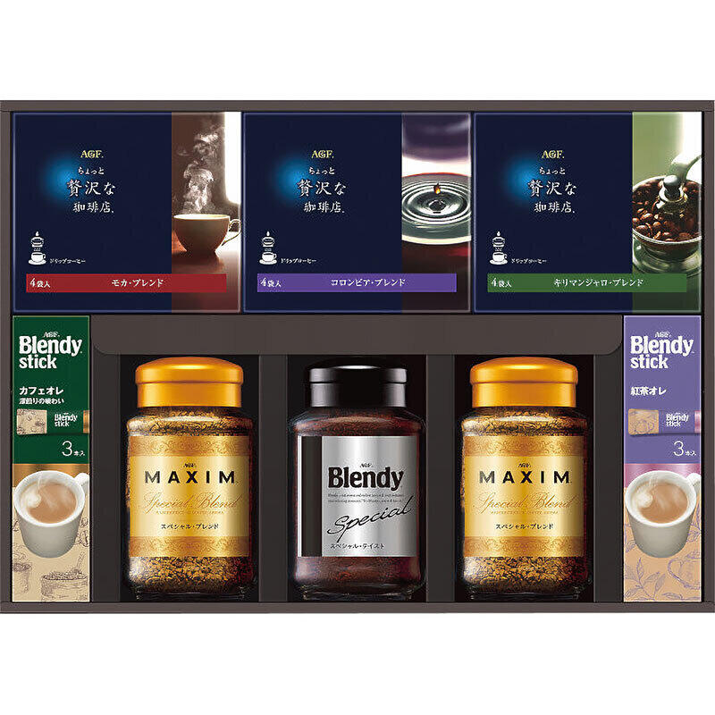 ちょっと贅沢な珈琲店 ドリップコーヒー(モカブレンド・コロンビアブレンド・キリマンジャロブレンド)×各4P、マキシムインスタントコーヒースペシャルブレンド65g×2・ブレンディインスタントコーヒースペシャルテイスト70g×1、ブレンディスティック(カフェオレ×2・紅茶オレ×1)×各3P