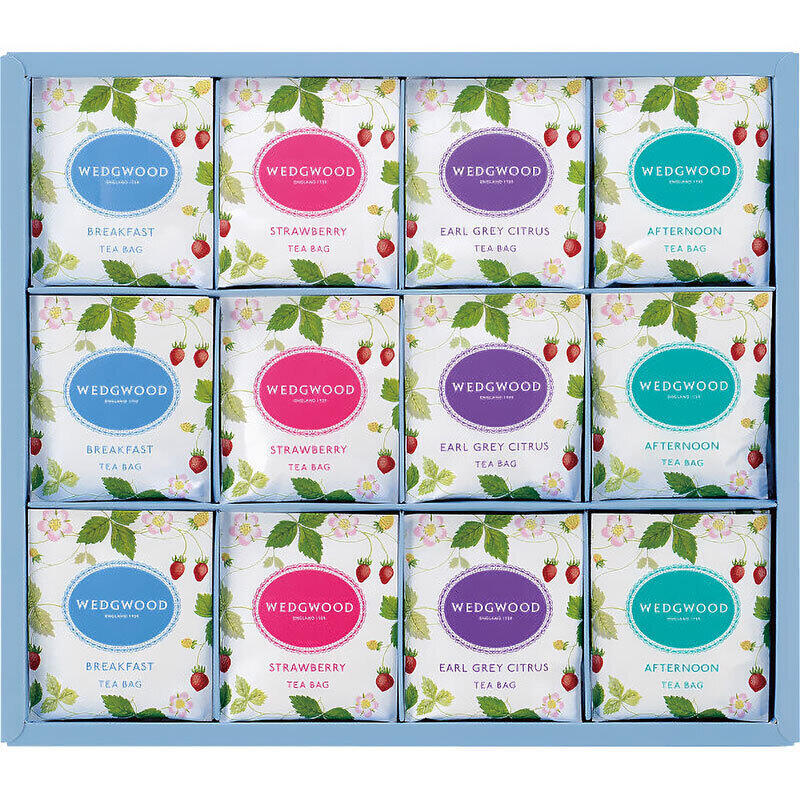 ウェッジウッドの代表パターン「ワイルド ストロベリー」のパッケージに包まれた4種類のアソートティーバッグ。その日の気分に合わせて楽しめます。