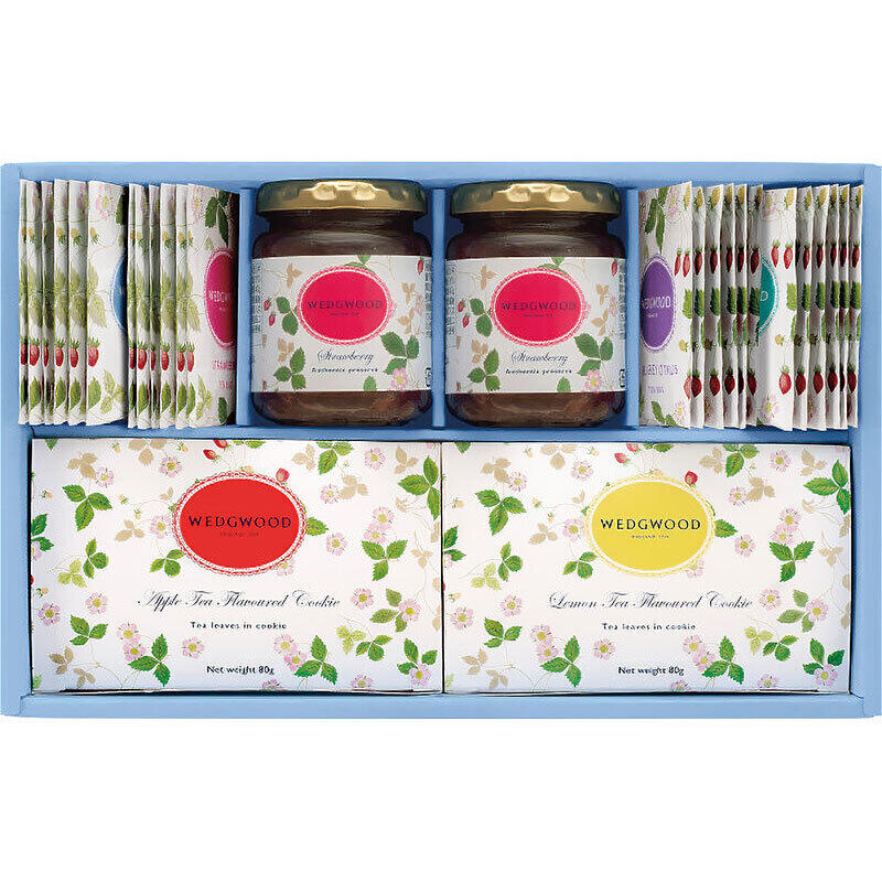 ウェッジウッドの代表パターン「ワイルド ストロベリー」のパッケージに包まれた紅茶・ジャム・クッキーのアソートセットは紅茶好きな方への贈りものにオススメです。手軽にティータイムをお楽しみください。
