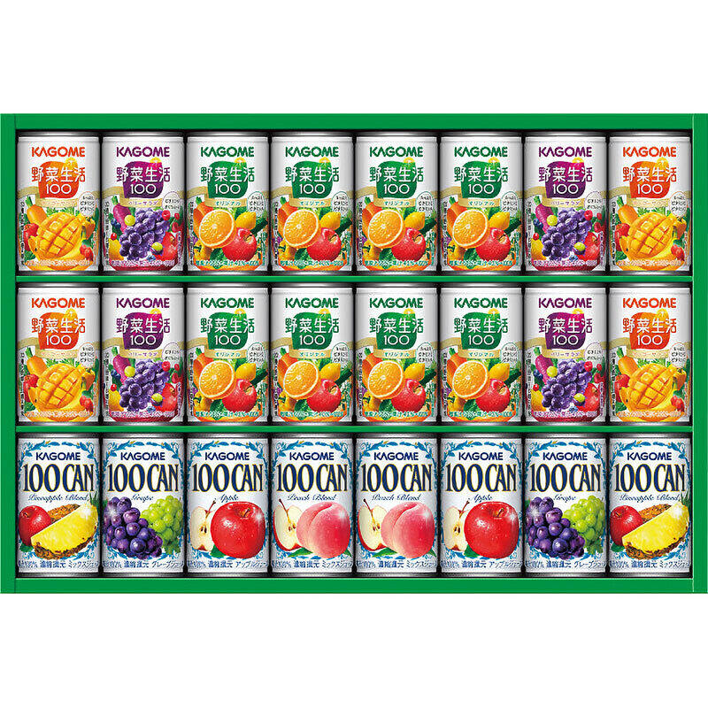 カゴメの100%フルーツジュースのベストセラー(1982年発売)「KAGOME100CAN」と野菜&フルーツのおいしさが人気の「野菜生活100」の詰め合わせギフトです。
