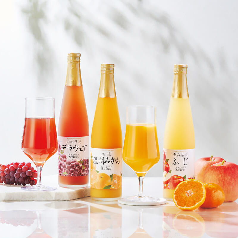 国産の「ふじ」、「デラウェア」、「温州みかん」をそれぞれ品種、収穫時期にこだわって搾汁しました。ストレートジュースの詰め合せです。