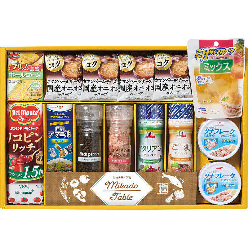 カマンベールチーズ入り国産オニオンのスープ(フリーズドライ)×4、ホールコーン190g、油そのままライトツナリセッタ70g×2、リコピンリッチトマトケチャップ285g、朝からフルーツミックス(パウチ)95g、ごまドレッシング150ml、イタリアンドレッシング150ml、ヒマラヤピンク岩塩100g、ブラックペッパー50g、日清アマニ油50g