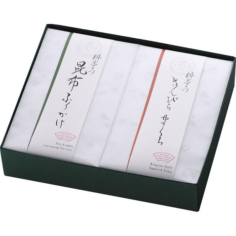 昆布ふりかけ、きんぴらまぐろの2種詰合せです。場面を選ばないすっきりとしたパッケージでご用意いたしました。