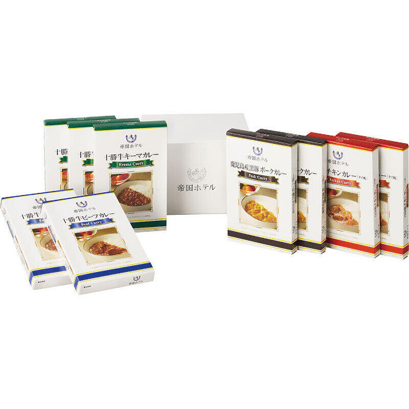 十勝牛キーマカレー90g×3、十勝牛ビーフカレー90g×2、日向鶏チキンカレー(タイ風)90g×2、鹿児島産黒豚ポークカレー90g×2(全てレトルト)