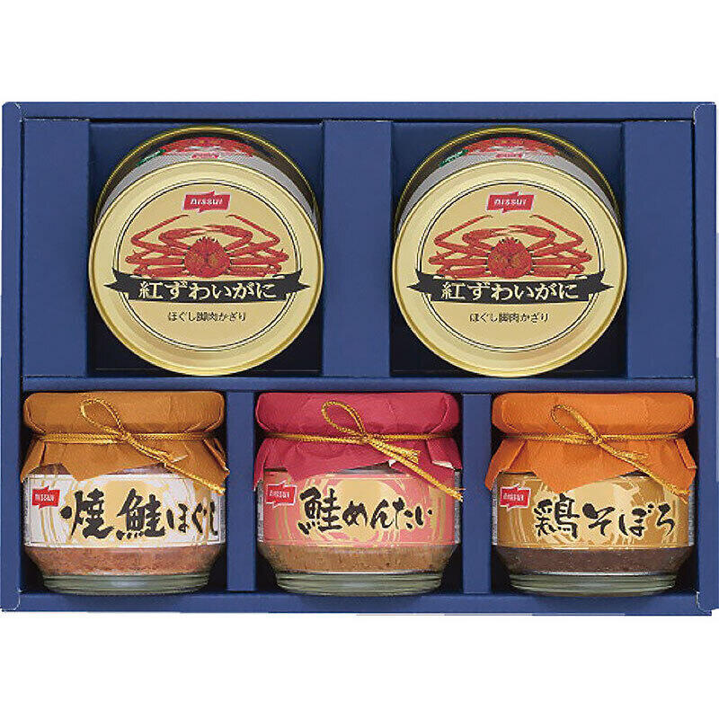 紅ずわいがにのほぐし身を中心に、焼鮭ほぐし、鮭めんたい、鶏そぼろを詰め合わせた人気のセットです。ごはんのお供や料理に使いやすく、お礼やご挨拶などの贈り物として、目上の方や幅広い年代の方にも選びやすい一品です