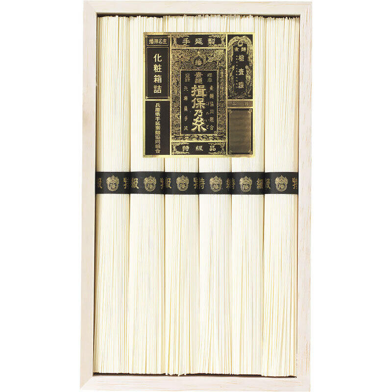 『手延素麺 揖保乃糸』特級品は、上級品よりワンランク上の小麦粉を使用し、11工程2昼夜をかけ何回も熟成を重ねながら手作業で引き延ばし乾燥させて作った高級素麺です。