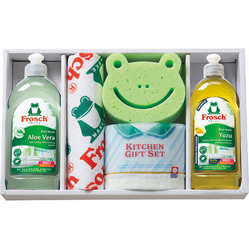 ウォッシュタオル・マイクロファイバークロス各1枚、スポンジ1個、フロッシュ食器用洗剤(アロエヴェラ)(300ml)・フロッシュ食器用洗剤プレミアム(ユズ)(300ml)各1本
