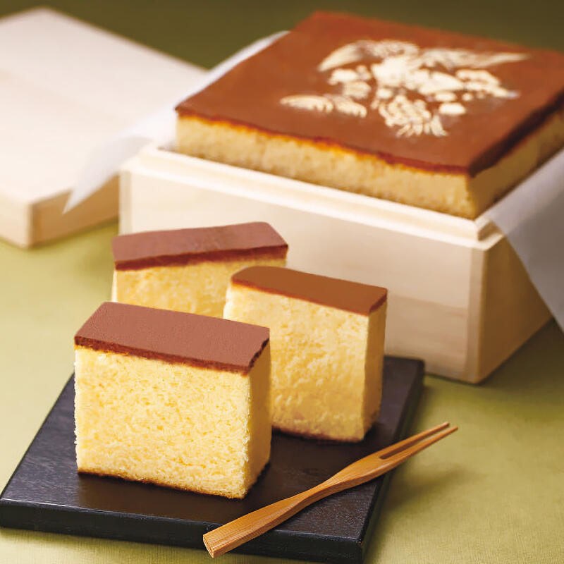 長﨑堂のカステーラに鶴亀の絵柄を刷込みました。