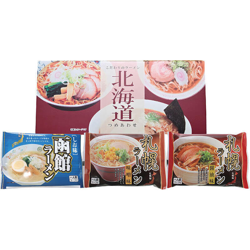札幌ラーメン醤油味(麺80g・スープ38g)、札幌ラーメン味噌味(80g・スープ37g)、函館ラーメン塩味(80g・スープ44g)(麺は全て乾麺)