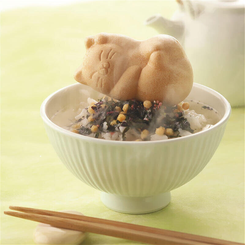 かわいらしい猫のかたちのもなかで、茶漬けを包みました。「ありがとうございます」のメッセージを添えて贈るプチギフトです。